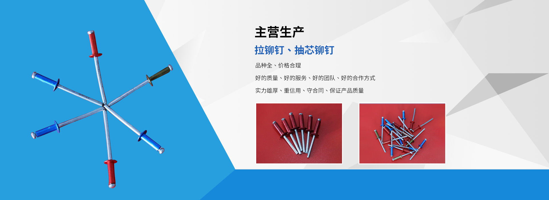 臨沂市龍牌異型鉚釘廠是拉鉚釘抽芯鉚釘等產品生產加工的個體經營,公司總部設在臨沂市羅莊區,臨沂市龍牌異型鉚釘廠具有完整、科學的質量管理體,公司自成立以來,一直秉承“質量為準,客戶至上”的經營理念,以產品“品種豐富、價格合理”,在消費者當中享有較高的身分,得到了廣大消費者的信賴與好平,公司并與多家零售商和代理商建立了長期穩定的合作關系,公司實力雄厚,重信用、守合同、產品質量放心,以多品種經營特色和薄利多銷的原則,歡迎廣大消費者前來洽談業務!
